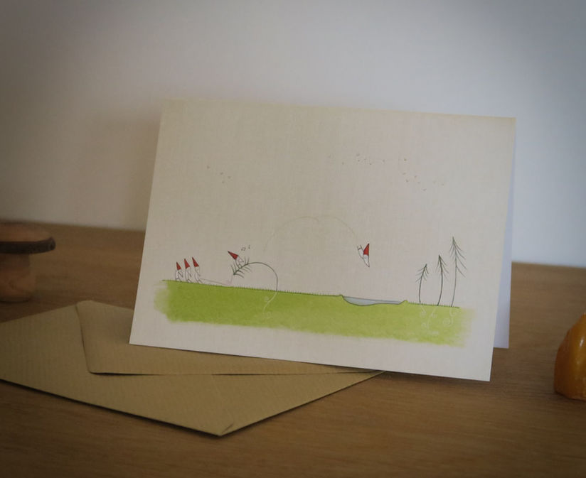 Eco friendly greeting card in envelope: drawing of gnomes having fun in the pond.